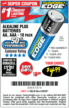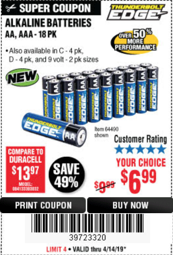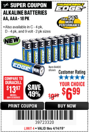 THUNDERBOLT EDGE AA PRIME POWER ALKALINE BATTERIES, 18-PACK Lot No. 64490/64490/64491/64492/64493 Expired: 4/14/19 - $6.99 Coupon Code: '63249977'
