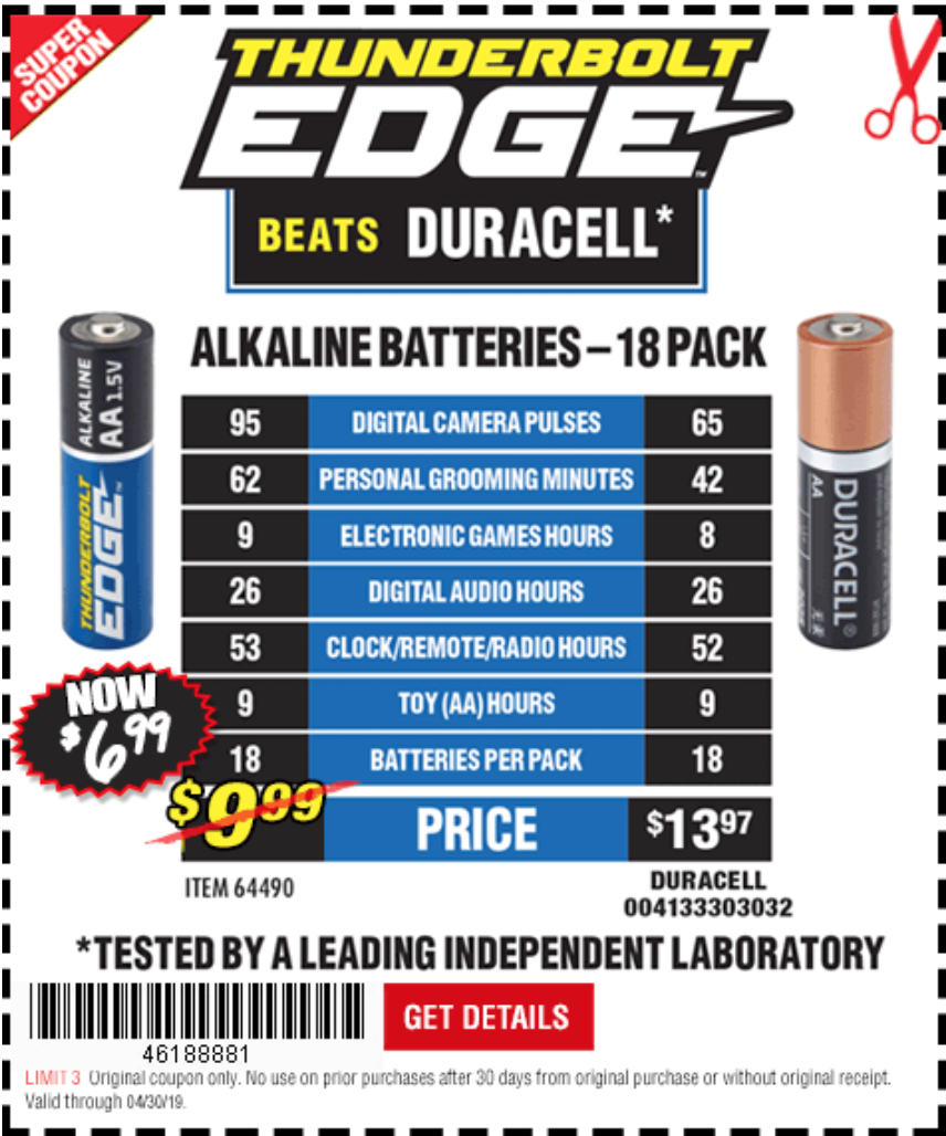 THUNDERBOLT EDGE AA PRIME POWER ALKALINE BATTERIES, 18-PACK Lot No. 64490/64490/64491/64492/64493 Expired: 4/30/19 - $6.99 Coupon Code: '46188881'