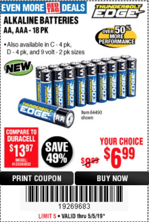 THUNDERBOLT EDGE AA PRIME POWER ALKALINE BATTERIES, 18-PACK Lot No. 64490/64490/64491/64492/64493 Expired: 5/5/19 - $6.99 Coupon Code: '19269683'