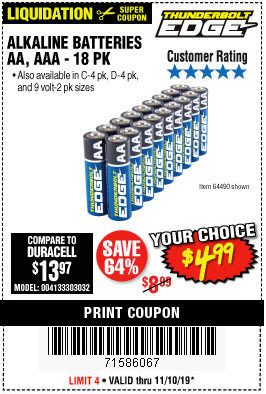 THUNDERBOLT EDGE AA PRIME POWER ALKALINE BATTERIES, 18-PACK Lot No. 64490/64490/64491/64492/64493 Expired: 10/31/19 - $4.99 Coupon Code: '53696346'