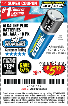 THUNDERBOLT EDGE AA PRIME POWER ALKALINE BATTERIES, 18-PACK Lot No. 64490/64490/64491/64492/64493 Expired: 2/29/20 - $5.99 Coupon Code: '40061575'