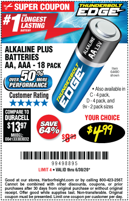 THUNDERBOLT EDGE AA PRIME POWER ALKALINE BATTERIES, 18-PACK Lot No. 64490/64490/64491/64492/64493 Expired: 6/30/20 - $4.99 Coupon Code: '99498895'