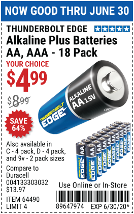 THUNDERBOLT EDGE AA PRIME POWER ALKALINE BATTERIES, 18-PACK Lot No. 64490/64490/64491/64492/64493 Expired: 6/30/20 - $4.99 Coupon Code: '89647974'