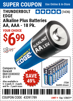 THUNDERBOLT EDGE AA PRIME POWER ALKALINE BATTERIES, 18-PACK Lot No. 64490/64490/64491/64492/64493 Expired: 1/28/21 - $6.99 Coupon Code: '43391789'