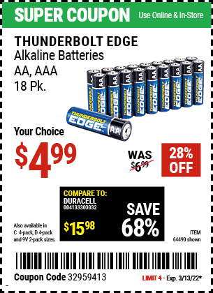 THUNDERBOLT EDGE AA PRIME POWER ALKALINE BATTERIES, 18-PACK Lot No. 64490/64490/64491/64492/64493 Expired: 3/13/22 - $4.99 Coupon Code: '32959413'