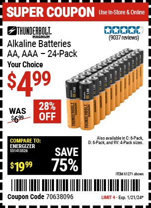THUNDERBOLT MAGNUM ALKALINE BATTERIES Lot No. 61271/92404/61270/61272/92406/61279/92408 Expired: 1/21/24 - $4.99 Coupon Code: '70638096'