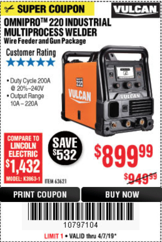 VULCAN OMNIPRO 220 INDUSTRIAL MULTIPROCESS WELDER WITH 120/240V INPUT Lot No. 57812/63621 Expired: 9/30/19 - $879.99 Coupon Code: '43316841'