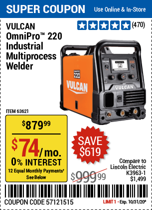 VULCAN OMNIPRO 220 INDUSTRIAL MULTIPROCESS WELDER WITH 120/240V INPUT Lot No. 57812/63621 Expired: 10/31/20 - $879.99 Coupon Code: '57121515'
