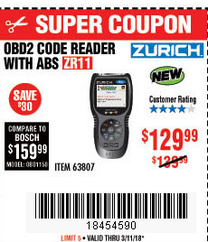 ZURICH OBD2 CODE READER WITH ABS ZR11 Lot No. 63807 Expired: 3/11/18 - $129.99 Coupon Code: '18454590'