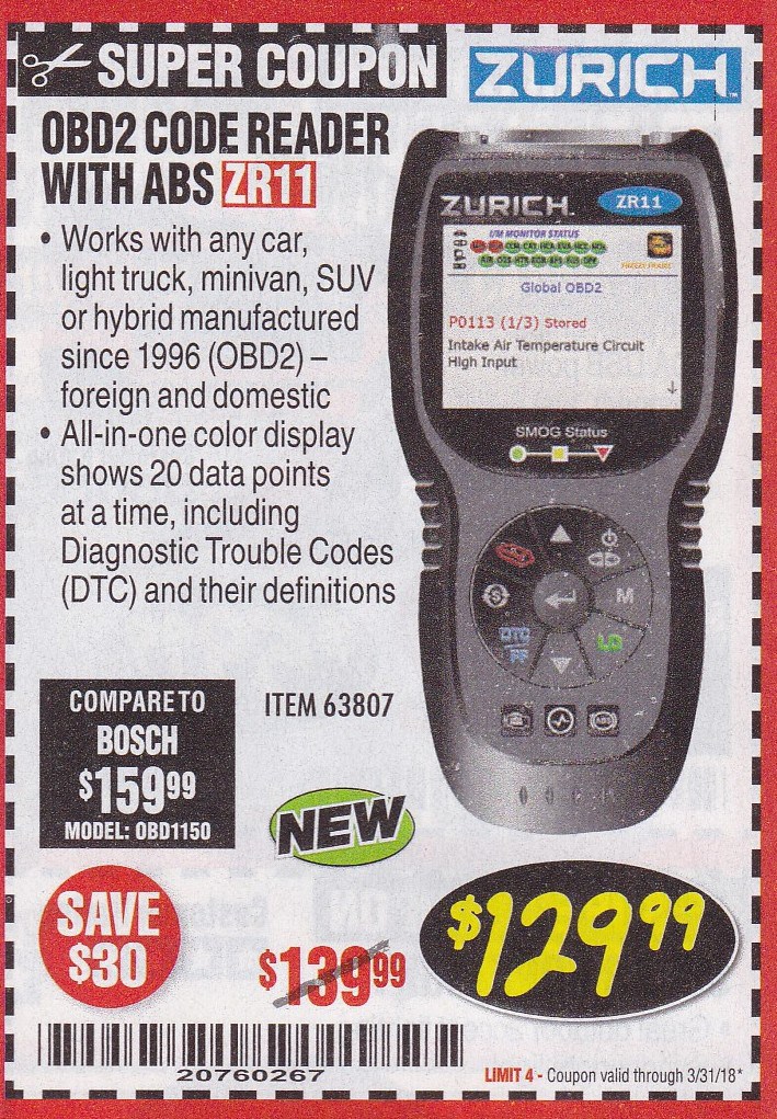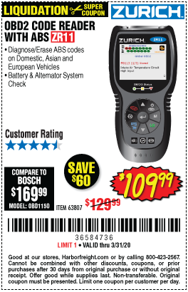 ZURICH OBD2 CODE READER WITH ABS ZR11 Lot No. 63807 Expired: 3/31/18 - $129.99 Coupon Code: '20760267'