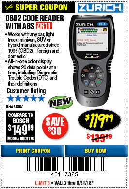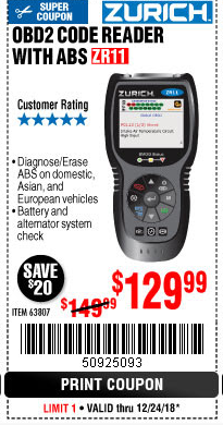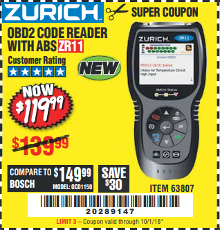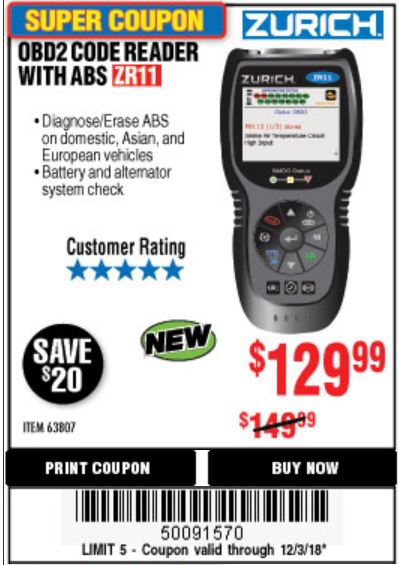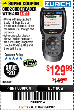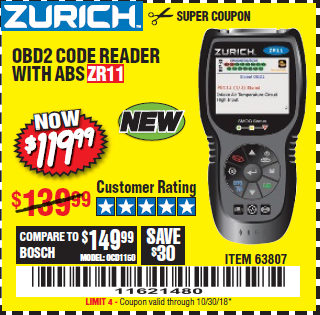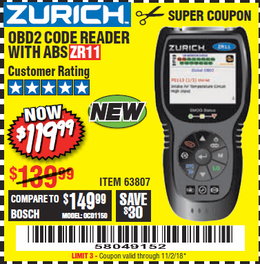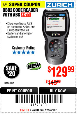 ZURICH OBD2 CODE READER WITH ABS ZR11 Lot No. 63807 Expired: 10/28/18 - $129.99 Coupon Code: '29008914'