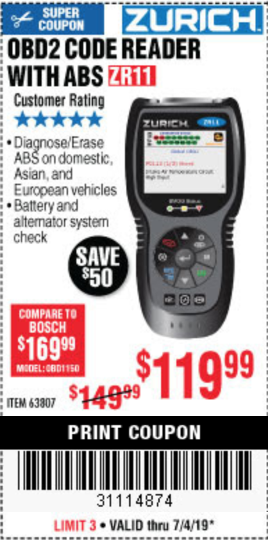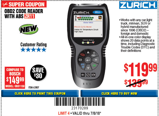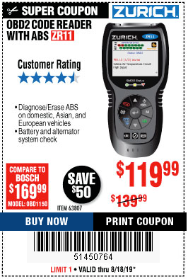 ZURICH OBD2 CODE READER WITH ABS ZR11 Lot No. 63807 Expired: 7/4/19 - $119.99 Coupon Code: '31114874'