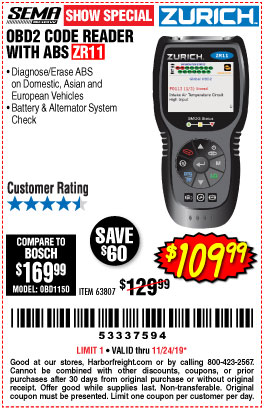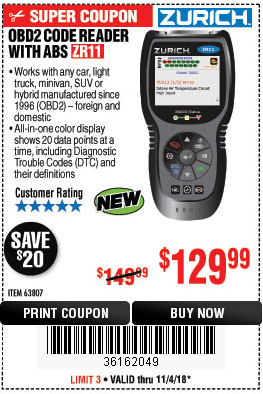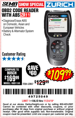 ZURICH OBD2 CODE READER WITH ABS ZR11 Lot No. 63807 Expired: 11/4/18 - $129.99 Coupon Code: '36162049'