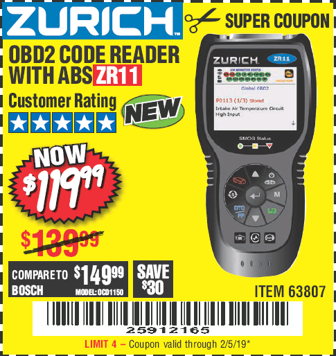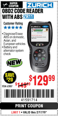 ZURICH OBD2 CODE READER WITH ABS ZR11 Lot No. 63807 Expired: 2/5/19 - $119.99 Coupon Code: '25912165'