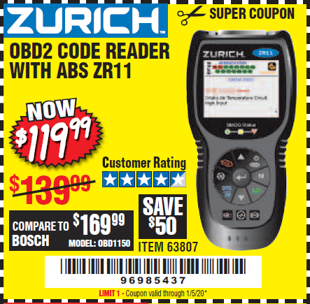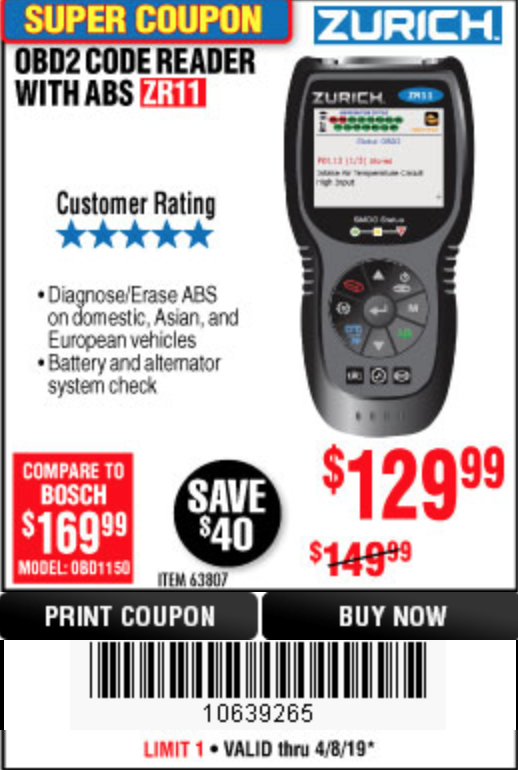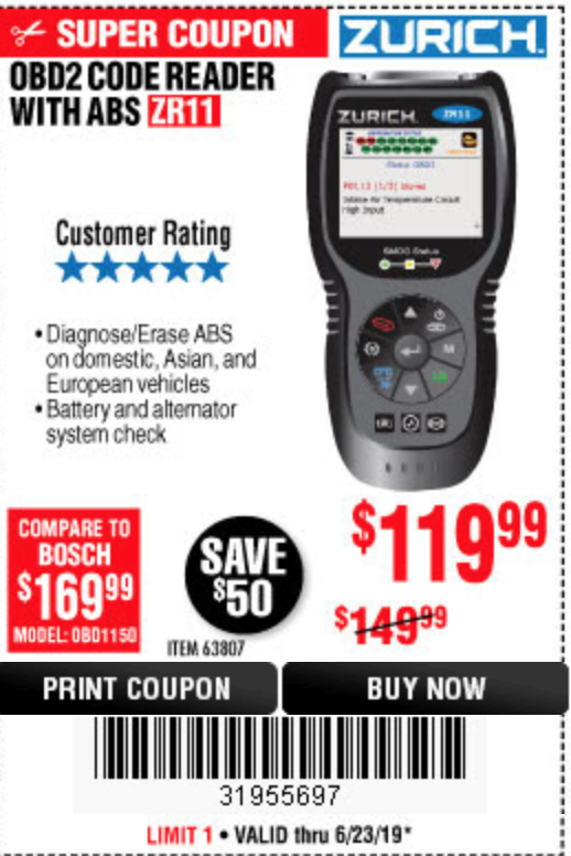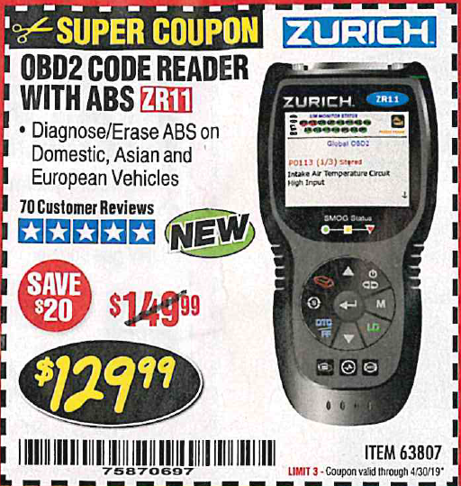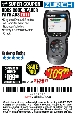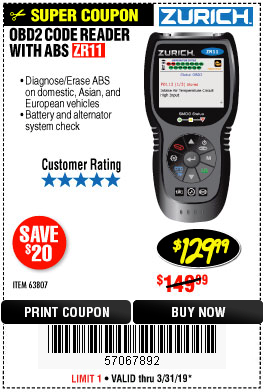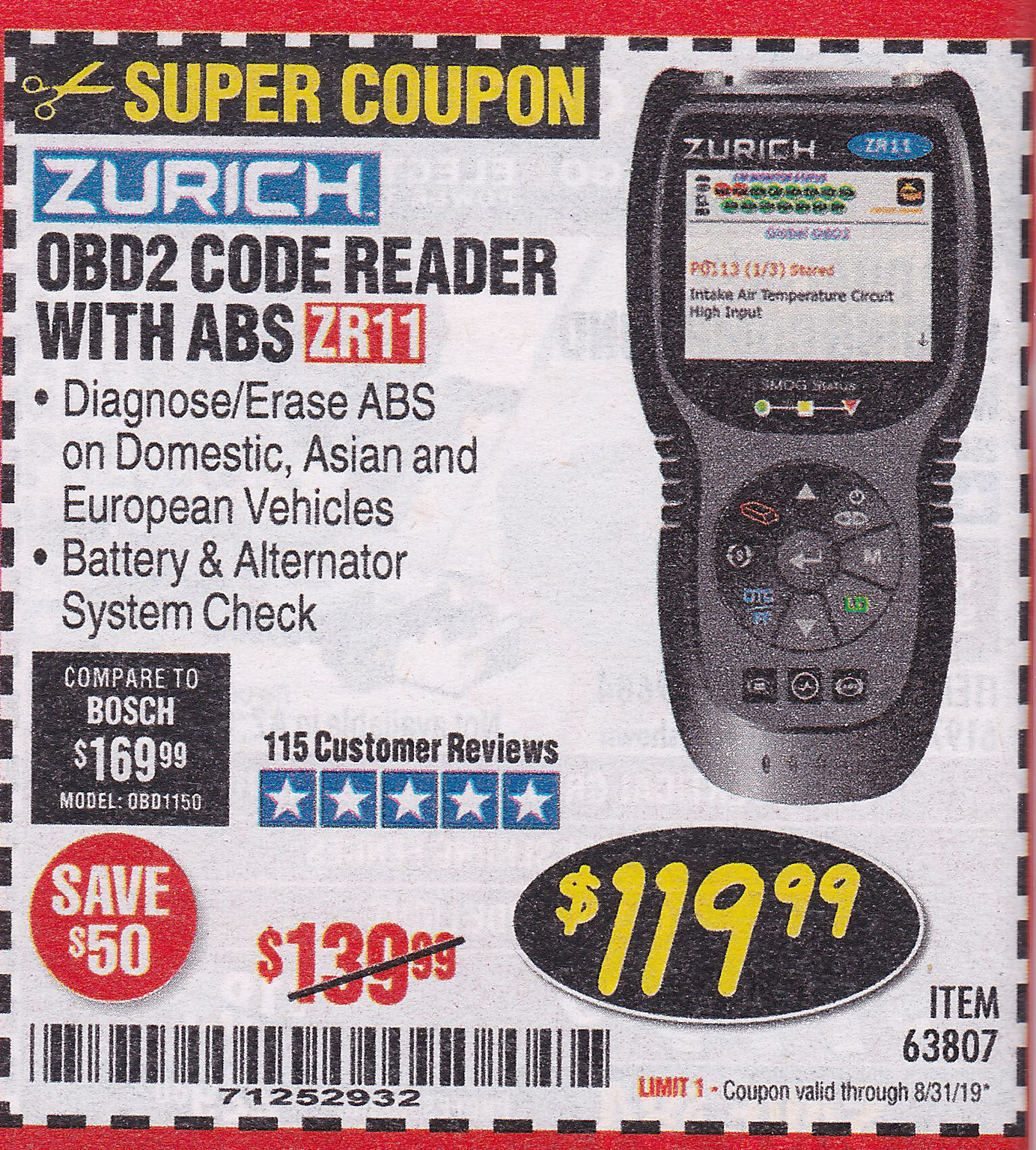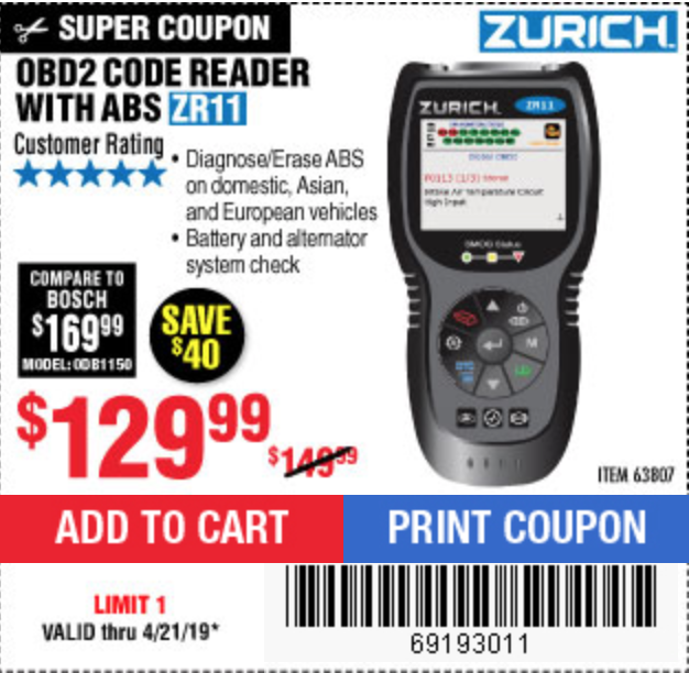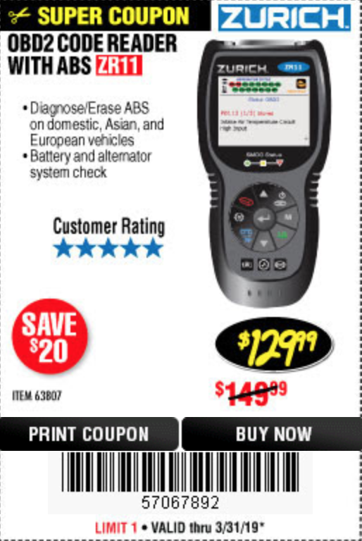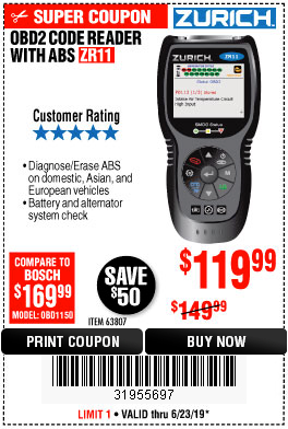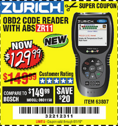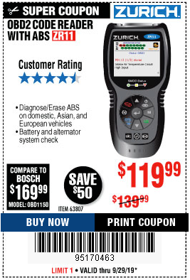 ZURICH OBD2 CODE READER WITH ABS ZR11 Lot No. 63807 Expired: 5/1/19 - $129.99 Coupon Code: '32212311'