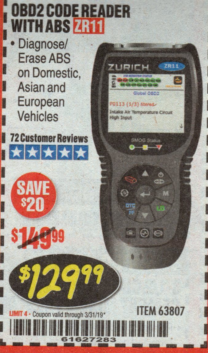 ZURICH OBD2 CODE READER WITH ABS ZR11 Lot No. 63807 Expired: 3/31/19 - $129.99 Coupon Code: '61627283'