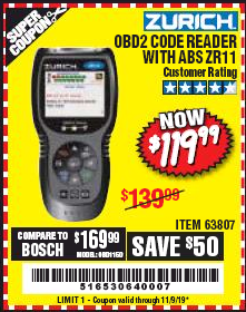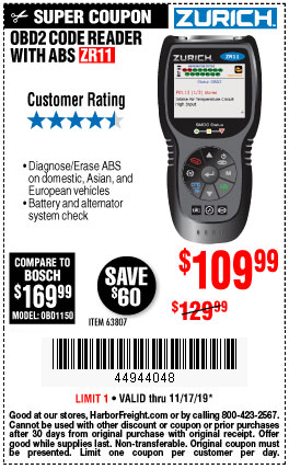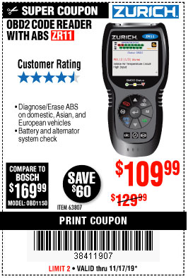 ZURICH OBD2 CODE READER WITH ABS ZR11 Lot No. 63807 Expired: 11/17/19 - $109.99 Coupon Code: '38411907'