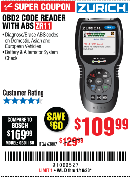 ZURICH OBD2 CODE READER WITH ABS ZR11 Lot No. 63807 Expired: 1/19/20 - $109.99 Coupon Code: '91069527'