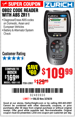 ZURICH OBD2 CODE READER WITH ABS ZR11 Lot No. 63807 Expired: 3/29/20 - $109.99 Coupon Code: '92483930'