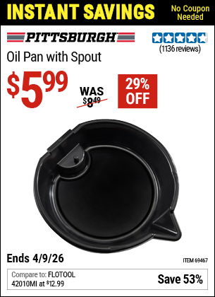 PITTSBURGH OIL PAN WITH SPOUT Lot No. 69467 EXPIRES: 4/9/26 - $5.99 Coupon Code: 'n/a' view all (1) (current price - 20% = 0) | search the web