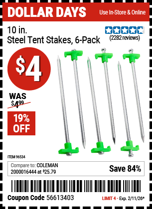 10 IN. STEEL TENT STAKES, 6-PACK Lot No. 96534 Expired: 10/31/19 - $2.99 Coupon Code: '68657525'