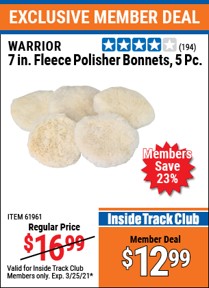 ITC 5 PIECE 7" FLEECE POLISHER BONNETS Lot No. 61961/93591 Expired: 3/25/21 - $12.99 Coupon Code: 'n/a'