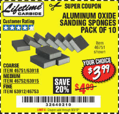 ALUMINUM OXIDE SANDING SPONGES PACK OF 10 Lot No. 46751/46752/46753 Expired: 8/16/20 - $3.99 Coupon Code: '40287178'