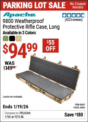APACHE 9800 WEATHERPROOF PROTECTIVE RIFLE CASE, LONG Lot No. 56862/64520/58657 Expired: 12/31/69 - $94.99 Coupon Code: 'n/a'