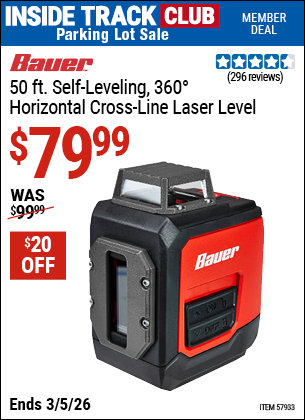 ITC BAUER 50 FT. SELF-LEVELING 360° HORIZONTAL CROSS-LINE LASER LEVEL Lot No. 57933 Expired: 3/5/26 - $79.99 Coupon Code: 'n/a'
