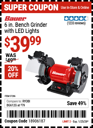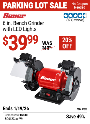 BAUER 6 IN. BENCH GRINDER WITH LED LIGHTS Lot No. 57286 Expired: 12/31/69 - $39.99 Coupon Code: 'n/a'