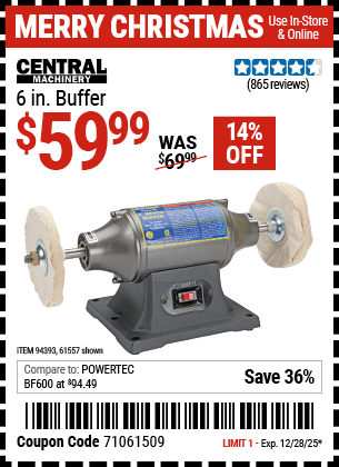 CENTRAL MACHINERY 6 IN. BUFFER Lot No. 61557/94393 Expired: 12/28/25 - $59.99 Coupon Code: '71061509'