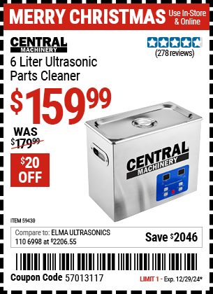 ITC CENTRAL MACHINERY 6 LITER ULTRASONIC PARTS CLEANER Lot No. 59430 Valid Thru: 1/15/26 - $139.99 Coupon Code: 'n/a' (current price - 20% = 0) add to list