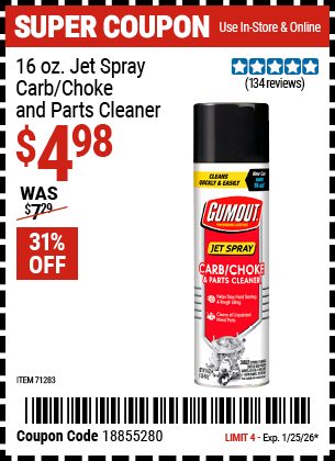 GUMOUT 16 OZ. JET SPRAY CARB/CHOKE AND PARTS CLEANER Lot No. 71283 Expired: 1/25/26 - $4.98 Coupon Code: '18855280'