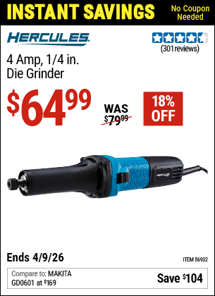 HERCULES 4 AMP, 1/4 IN. DIE GRINDER Lot No. 56932 Valid Thru: 4/9/26 - $64.99 Coupon Code: 'n/a' (current price - 20% = 0) add to list