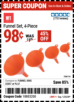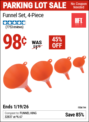 HFT FUNNEL SET, 4-PIECE Lot No. 744 Expired: 1/25/20 - $0.79 Coupon Code: '86190914'