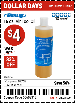 MERLIN 16 OZ. AIR TOOL OIL Lot No. 71298 Valid Thru: 2/11/26 - $4 Coupon Code: '56602312' (current price - 20% = 0) add to list