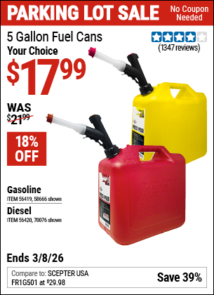 MIDWEST CAN 5 GALLON FUEL CANS Lot No. 56419/56420/58666/70076 Expired: 3/31/20 - $17.99 Coupon Code: '58299735'
