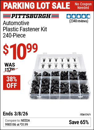 ITC PITTSBURGH AUTOMOTIVE PLASTIC FASTENER KIT, 240-PIECE Lot No. 57671 Expired: 3/5/26 - $10.99 Coupon Code: 'n/a'