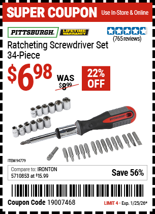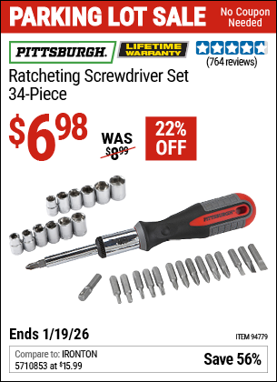 PITTSBURGH RATCHETING SCREWDRIVER SET, 34-PIECE Lot No. 94779 Expired: 12/31/69 - $6.98 Coupon Code: 'n/a'