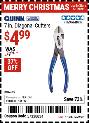 QUINN 7 IN. DIAGONAL CUTTERS Lot No. 64573 Expired: 12/29/24 - $4.99 Coupon Code: '57330034'