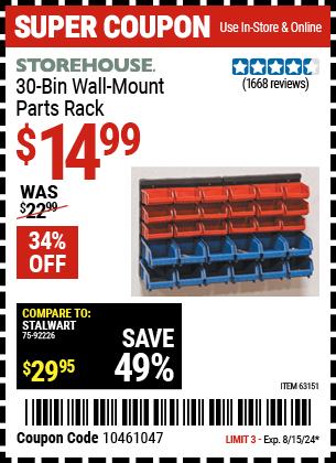 STOREHOUSE 30 BIN WALL PARTS RACK Lot No. 63306/63151 Expired: 8/15/24 - $14.99 Coupon Code: '10461047'
