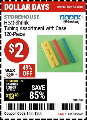STOREHOUSE HEAT-SHRINK TUBING ASSORTMENT WITH CASE, 120-PIECE Lot No. 67530 Valid Thru: 10/22/25 - $3 Coupon Code: '16971724' (current price - 20% = 0) add to list
