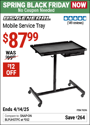 U.S. GENERAL ADJUSTABLE HEIGHT MOBILE SERVICE TRAY Lot No. 70296 Expired: 4/14/25 - $87.99 Coupon Code: 'n/a'