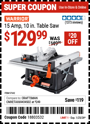 WARRIOR 15 AMP, 10 IN. TABLE SAW Lot No. 57342 Expired: 12/31/69 - $129.99 Coupon Code: 'n/a'