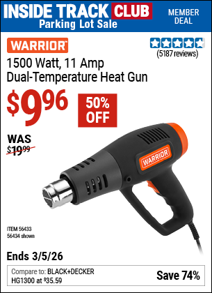 WARRIOR 1500 WATT, 11 AMP DUAL-TEMPERATURE HEAT GUN Lot No. 56434/56433 Expired: 3/8/26 - $9.96 Coupon Code: 'n/a'