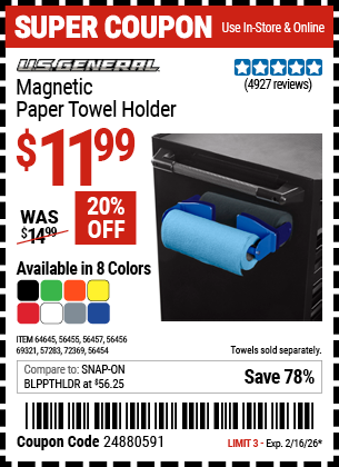 U.S. GENERAL MAGNETIC PAPER TOWEL HOLDER Lot No. 56454/56455/56456/56457/57283/64645/69321/72369 EXPIRES: 2/16/26 - $11.99 Coupon Code: '24880591' view all (1) (current price - 20% = 0) | search the web