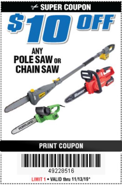 $10 OFF ANY POLE SAW OR CHAIN SAW Lot No. N/A Expired: 11/13/19 - $0 Coupon Code: '49228516'