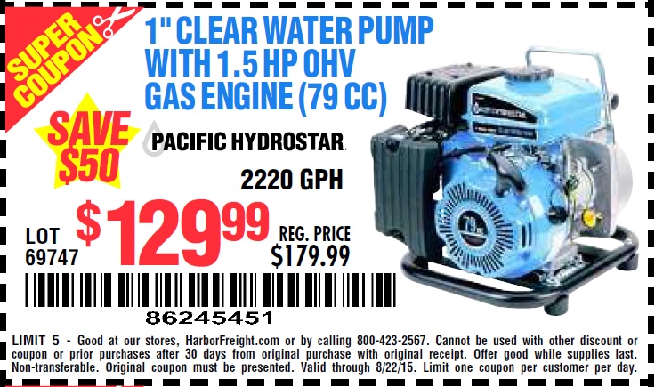 1" CLEAR WATER PUMP WITH 1.5 HP GAS ENGINE (79CC) Lot No. 69747 Expired: 8/22/15 - $129.99 Coupon Code: '86245451'