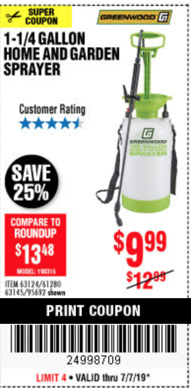 1-1/4 GALLON HOME AND GARDEN SPAYER Lot No. 63124/61280/63145/95692 Expired: 7/7/19 - $9.99 Coupon Code: '24998709'