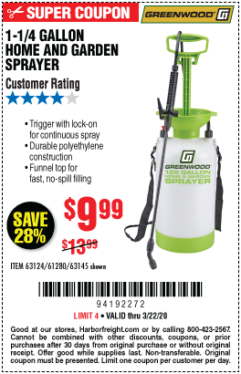 1-1/4 GALLON HOME AND GARDEN SPAYER Lot No. 63124/61280/63145/95692 Expired: 3/22/20 - $9.99 Coupon Code: '94192272'